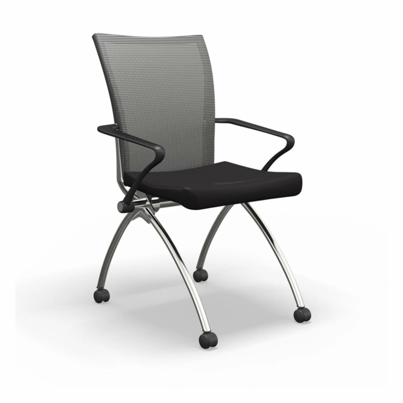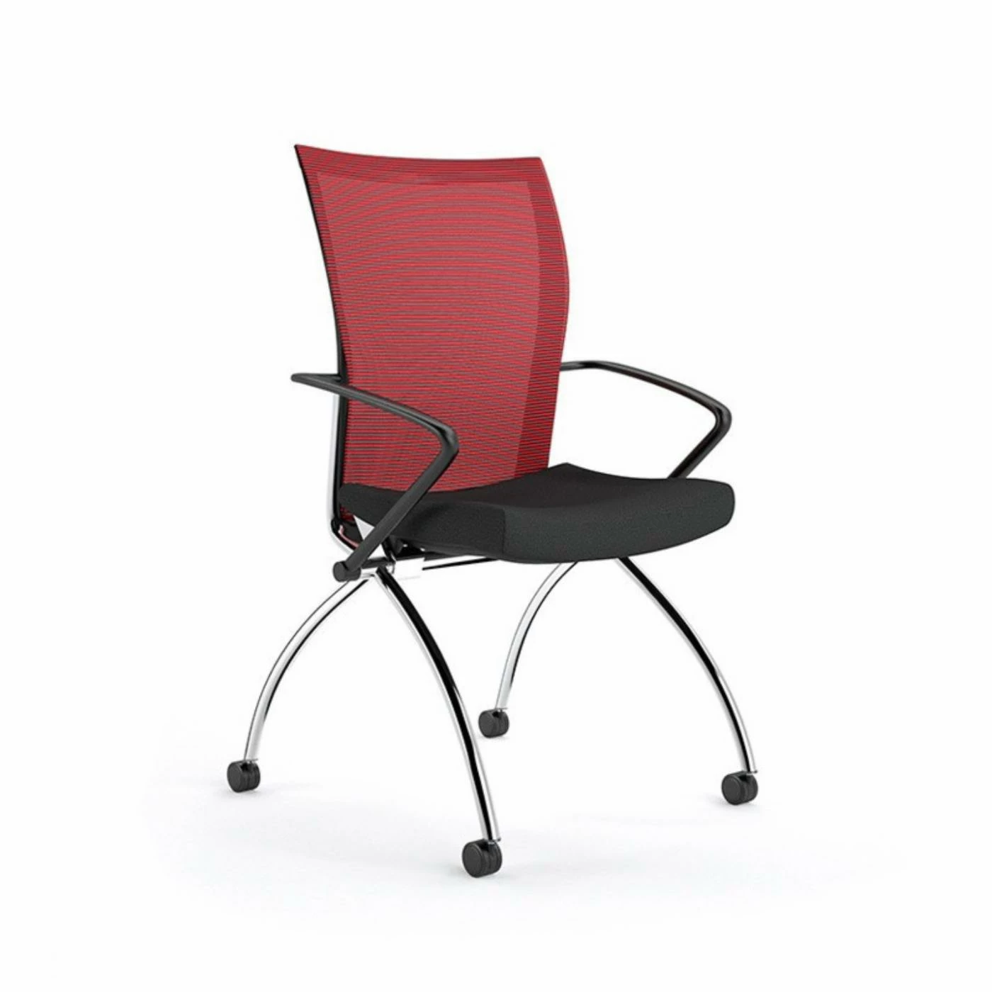 Designed for training purposes, the Mayline Valore Training High-Back Nesting Chair with Arms (Set of 2) offers a lightweight and stylish seating option. This highback chair boasts synchro-tilt movement and fixed arms with a mesh backrest available in your choice of colors. The black upholstered cushioned seat flips up, allowing you to stack these chairs up to four high for convenient and compact storage. Chrome legs are capped by dual-hooded casters, offering ease of movement whether you use these chairs in an office or a conference room setting.