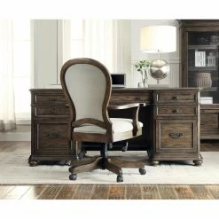 Combining the practical needs of a well-made office chair with your desire for exquisite design, the Riverside Furniture Belmeade Round Back Desk Chair is sure to be a favorite. Its durable, solid hickory wood construction holds up beautifully through the years while the linen and polyester blend fabric is easy to maintain and keep clean. The medium brown finish and off-white fabric combine with the transitional design of the chair to give you a piece that goes with most decors. Style meets design in the adjustable seat and adjustable arm height. Making it easy to find the perfect height for your comfort, this chair features a gas life height adjustment handle thatβs simple to use. It also has a rocker tension adjustment knob so you can make sure the chair doesnβt lean too far back on its five-prong tilt base. Able to swivel as well as move around smoothly on caster wheels, youβll have no trouble reaching every area of your desk as needed.