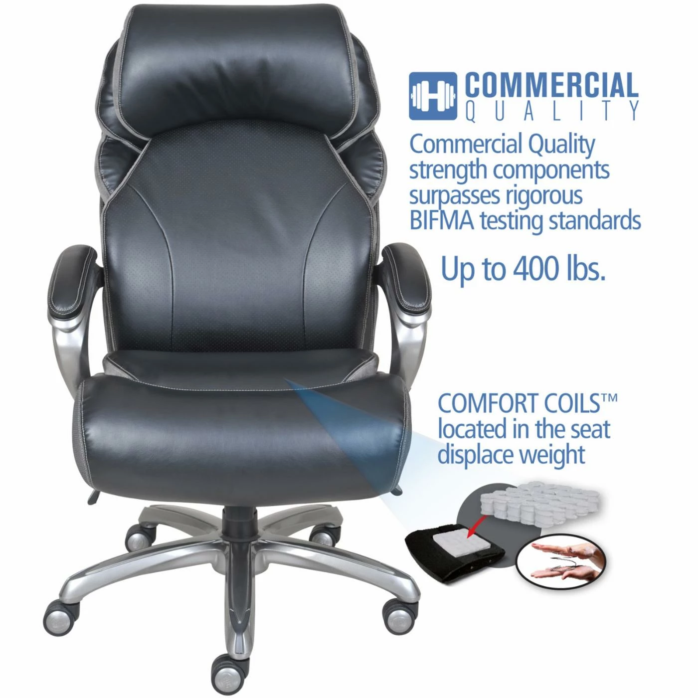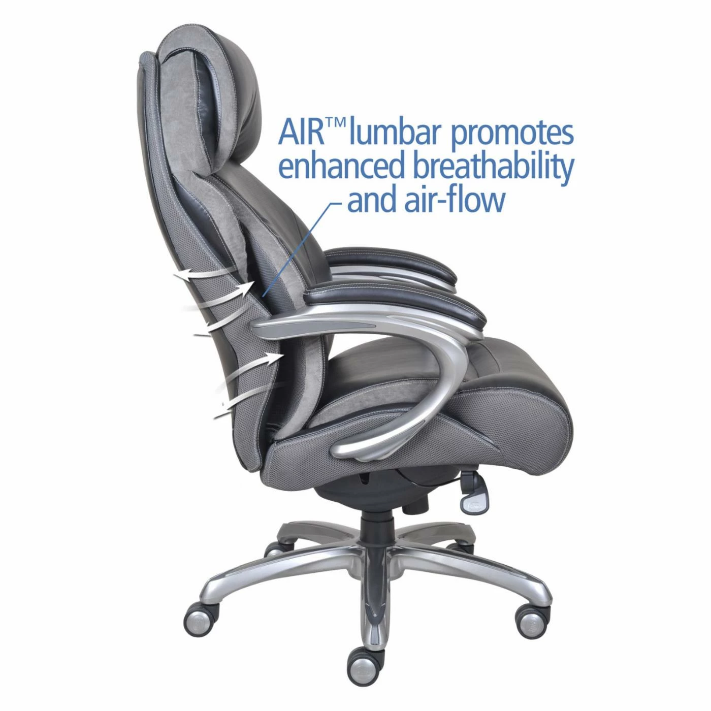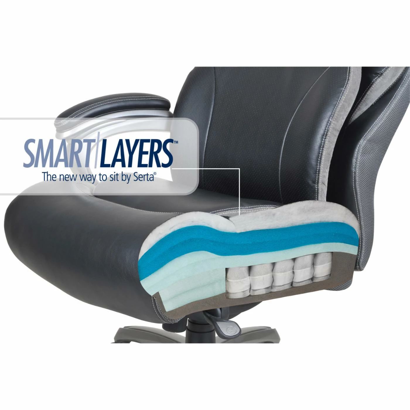 The Serta Smart Layers Big and Tall Executive Office Chair with Air Technology provides comfortable support while you work. Upholstered in supple leather, this ergonomic chair has a five-layer cushioning system and a lumbar zone that pivots and flexes to provide back support and improve posture. The easy-to-use controls let you position the chair to fit your needs.