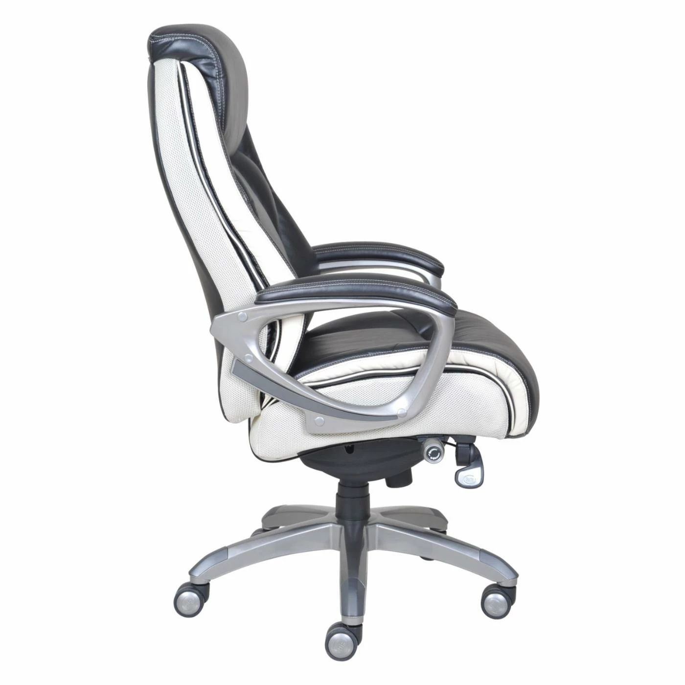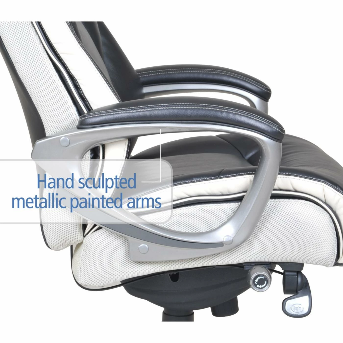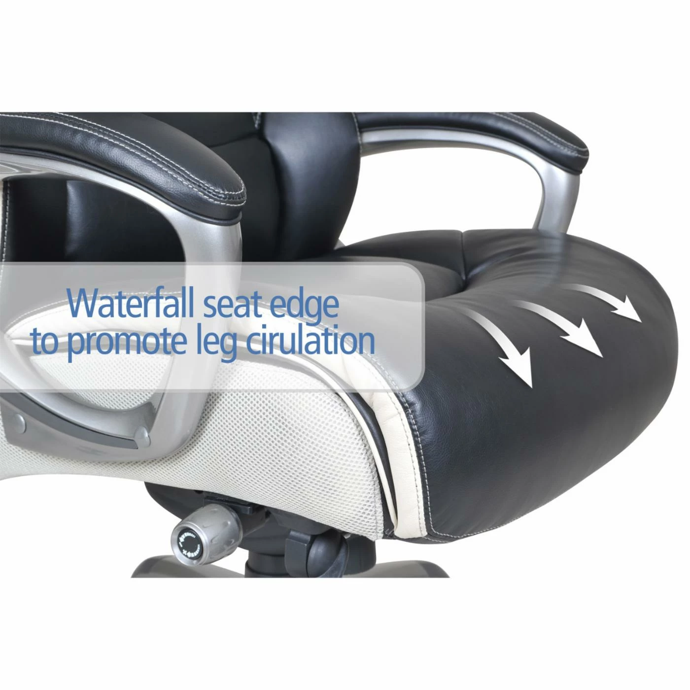With its soft leather upholstery, pillowed headrest, and premium five-layer cushioning system, the Serta Smart Layers Executive Office Chair provides support and comfort throughout the workday. Use the easy-to-reach controls to adjust the height and arm position to improve your posture.