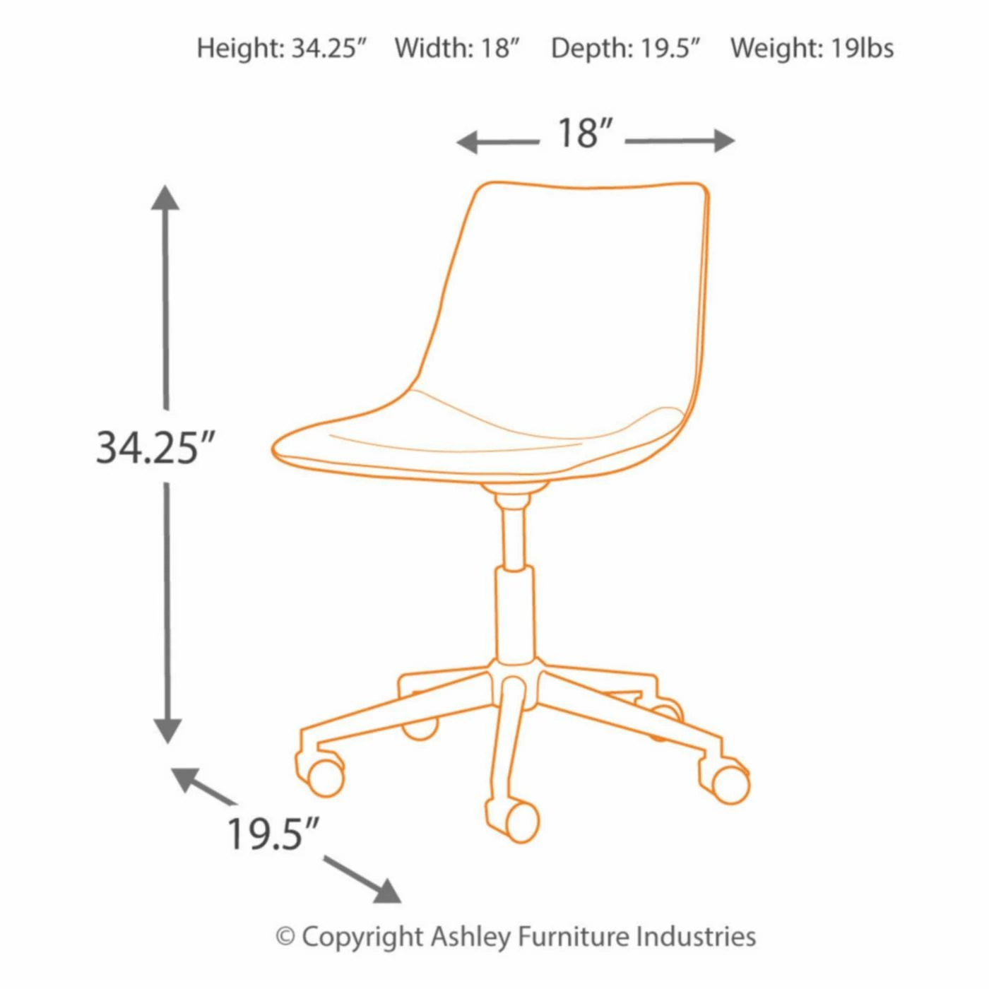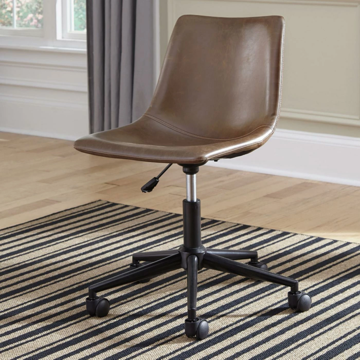 Introduce a relaxed modern seat to your home or office with the Signature Design by Ashley Home Office Mid-Back Swivel Task Chair. This armless task chair has a chic and simple look that’s as charming as it is utilitarian. Its seat and mid-height backrest are contoured and padded with foam for comfort and support. Deep saddle-brown faux leather upholsters the seat. The frame is made from metal and plastic with a height-adjustment lever and swivel base. A five-footed castered base offers rolling mobility.