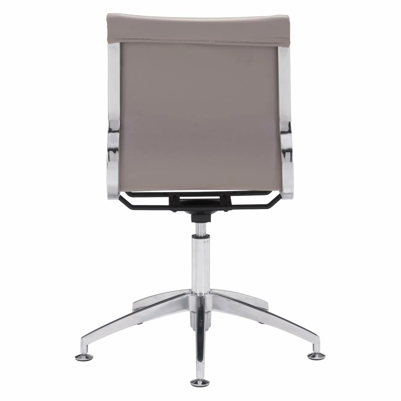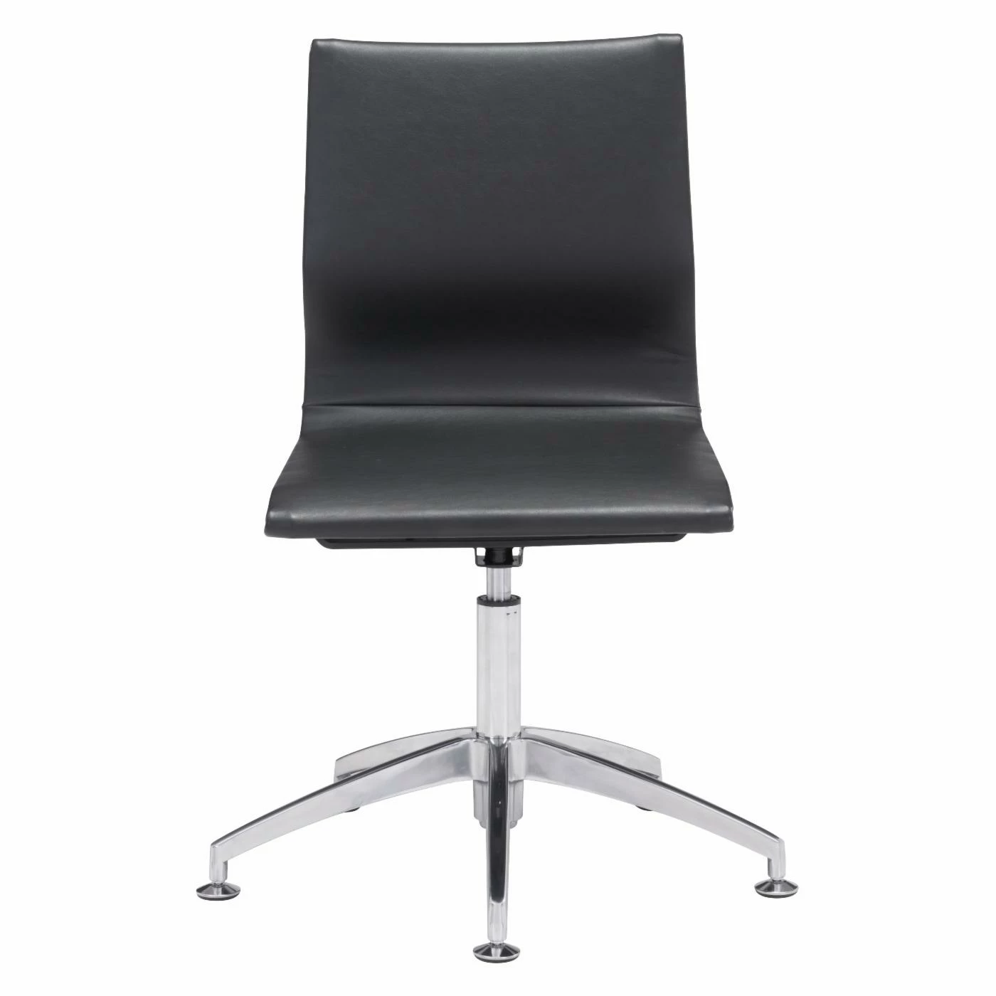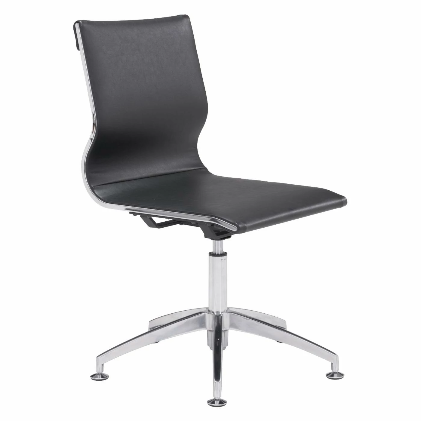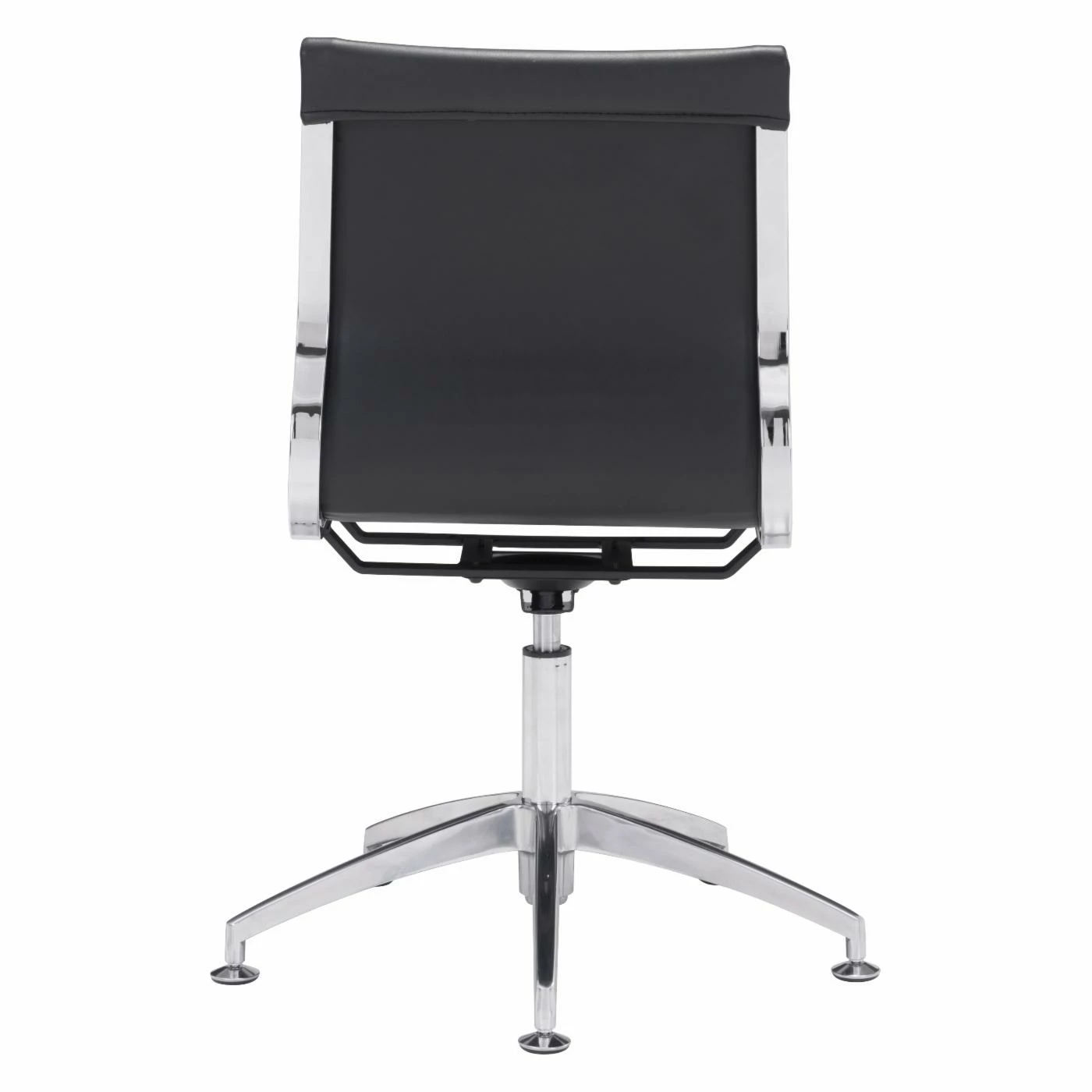 Less is more, and the minimal design of the Glider Conference Task Chair definitely offers a lot. This modern chair features a sinuous curve that gives you a roomy, mid-back shaped seat with plenty of lumbar support. The chromed steel frame is home to dense foam padding beneath a supple leatherette upholstery. The chromed steel base has a star-shaped design that stands on adjustable glides. Be sure to take a moment to look over our variety of color options for the faux-leather upholstery.