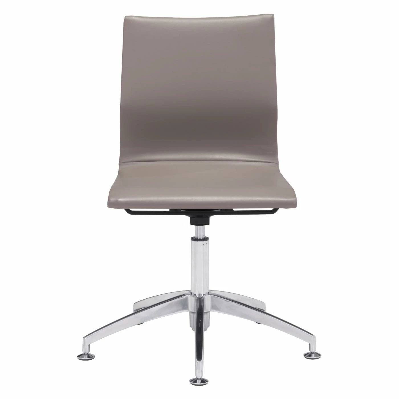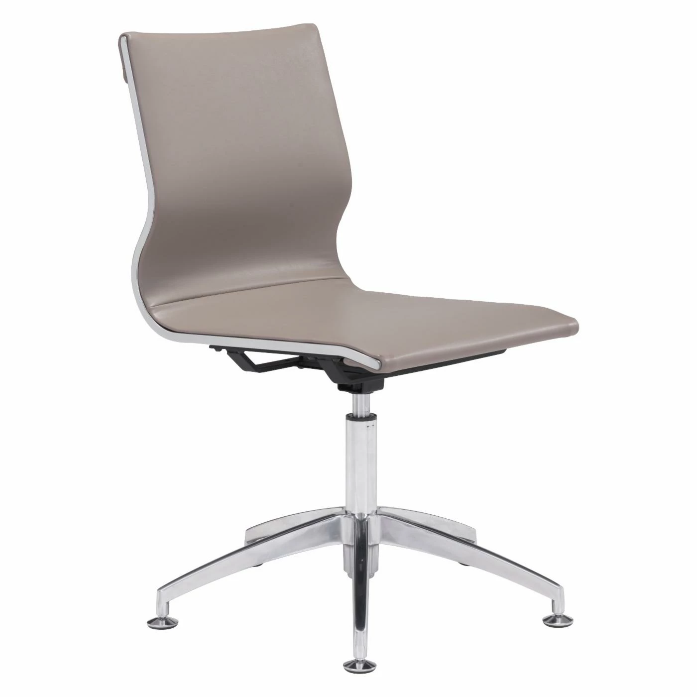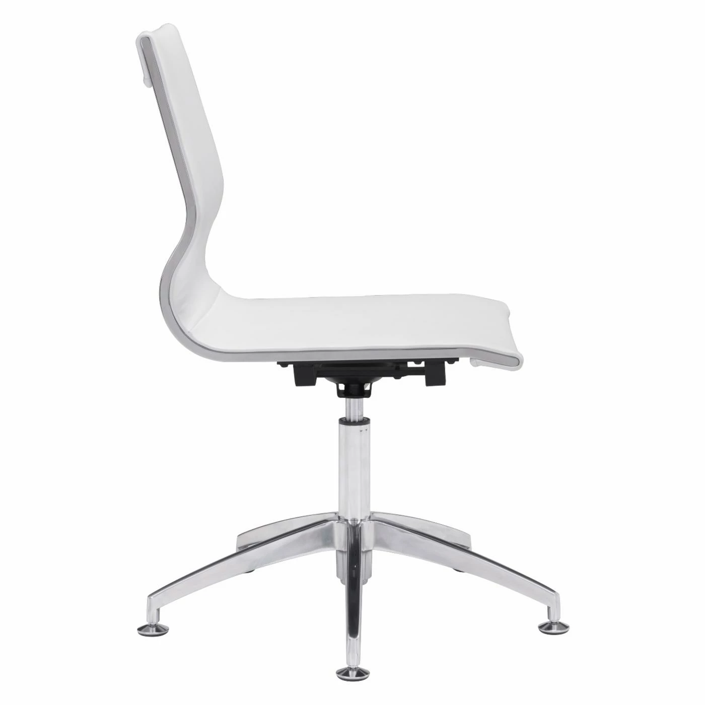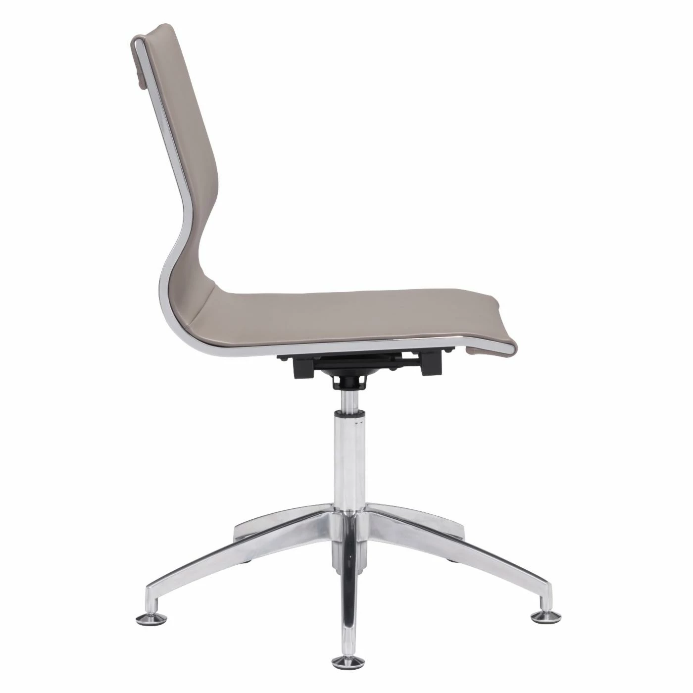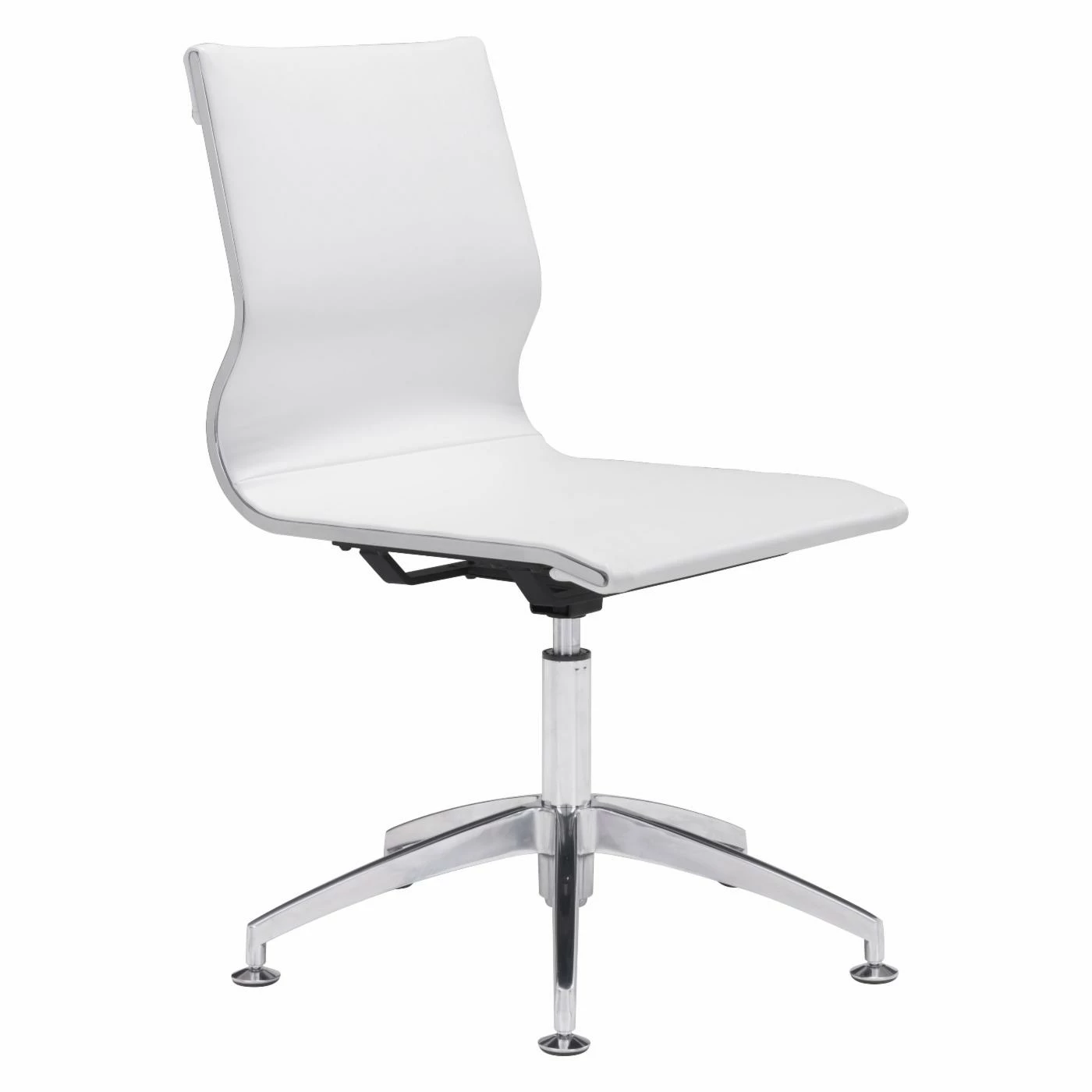 Less is more, and the minimal design of the Glider Conference Task Chair definitely offers a lot. This modern chair features a sinuous curve that gives you a roomy, mid-back shaped seat with plenty of lumbar support. The chromed steel frame is home to dense foam padding beneath a supple leatherette upholstery. The chromed steel base has a star-shaped design that stands on adjustable glides. Be sure to take a moment to look over our variety of color options for the faux-leather upholstery.